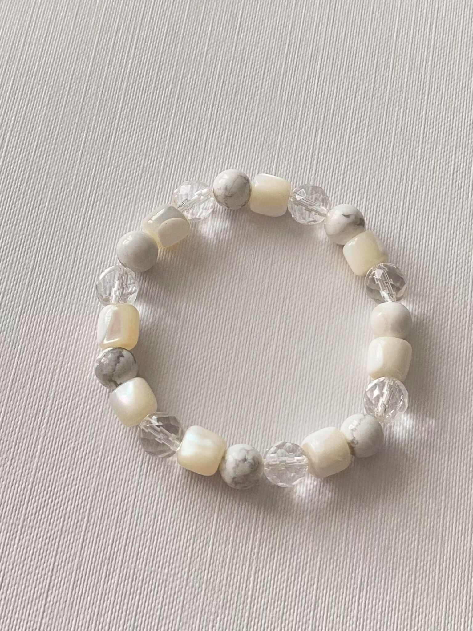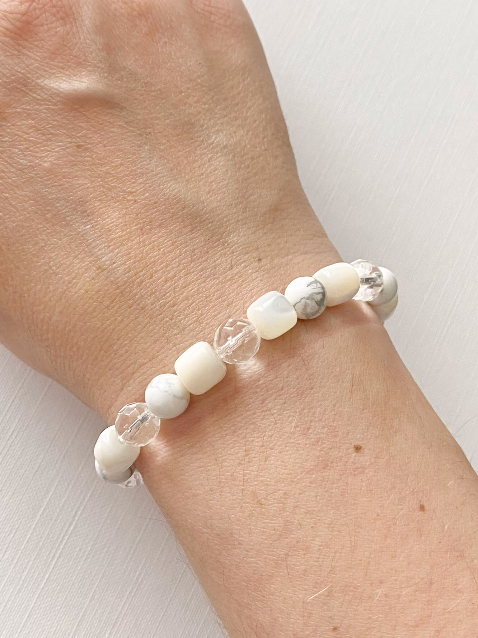 Armand med pärlemor, bergskristall och howlit.